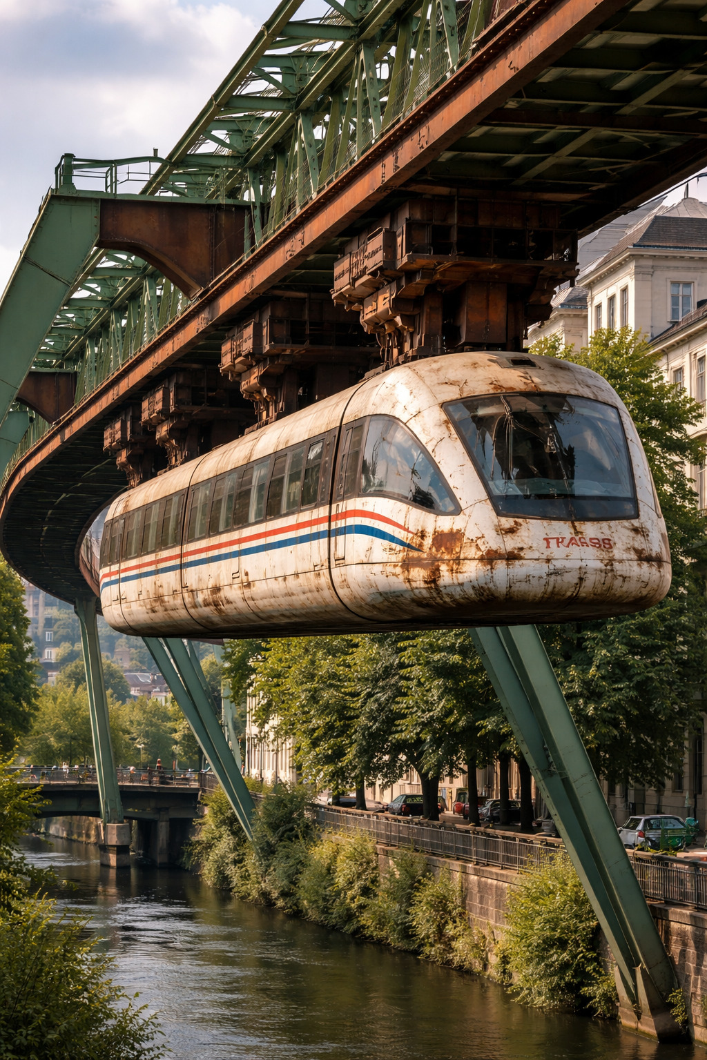 Prompt: Fotorealistisches Bild der Wuppertaler Schwebebahn-Stützen, aber statt der normalen Gondel hängt ein verrosteter Transrapid verkehrtrum unter der Schiene.Informationen zu dieser Datei:
